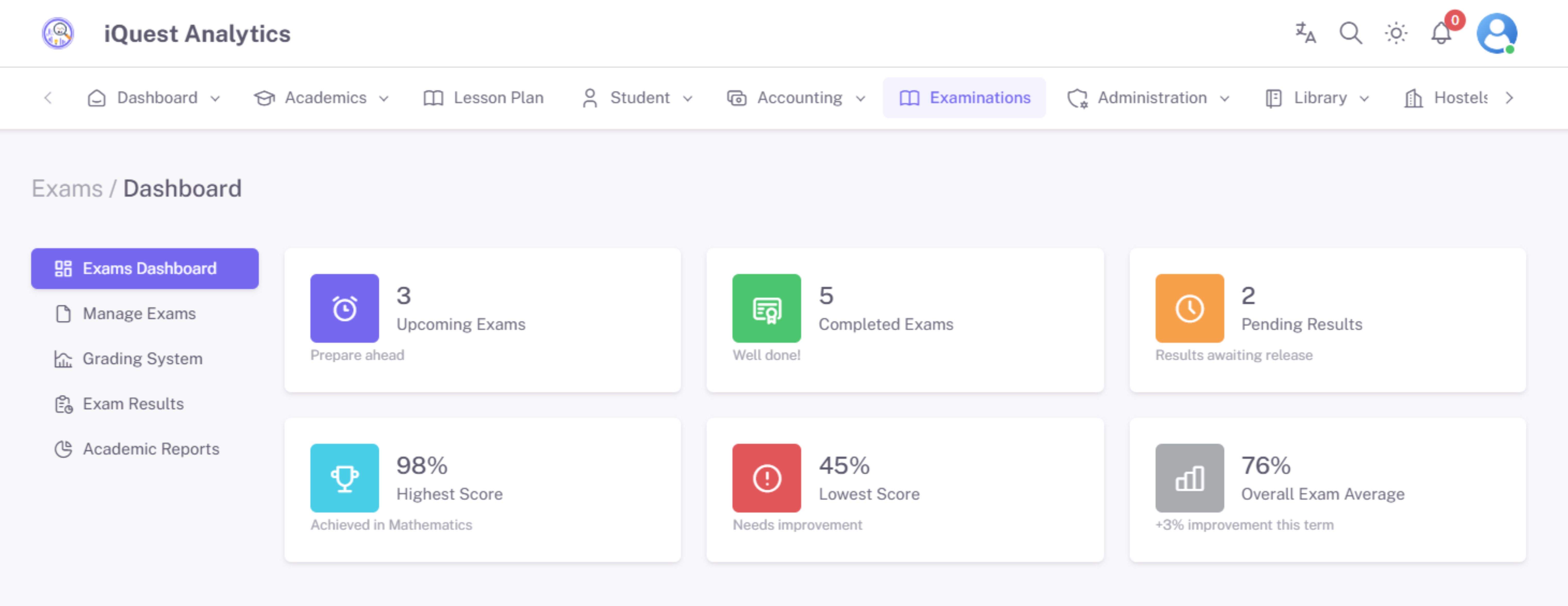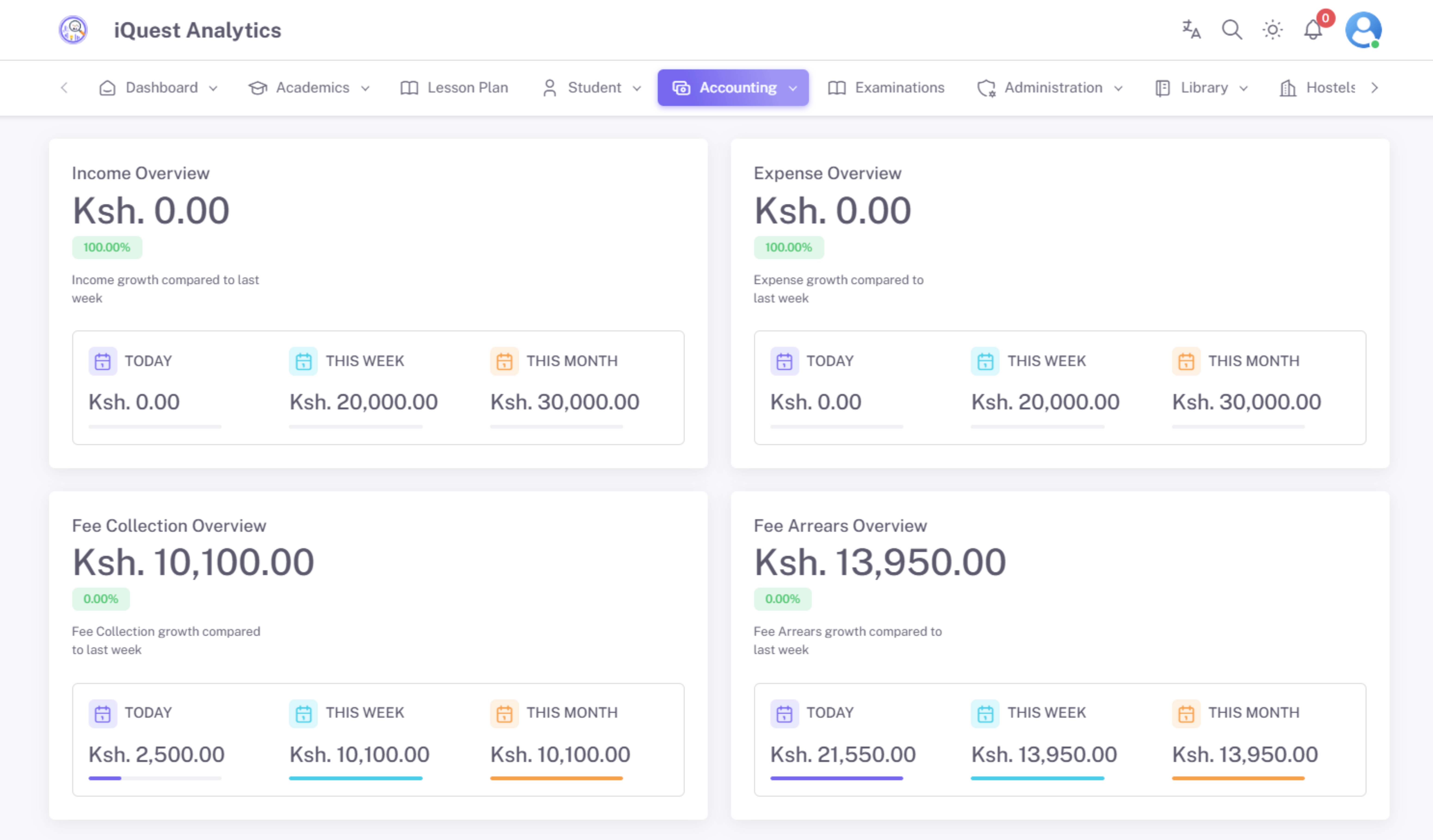 The Dashboard Analytics module in iQuest Analytics provides a comprehensive, real-time overview of key school metrics through interactive charts, graphs, and reports. This feature enables school administrators, teachers, and stakeholders to make data-driven decisions by monitoring academic performance, student engagement, financial status, and overall school operations at a glance.
